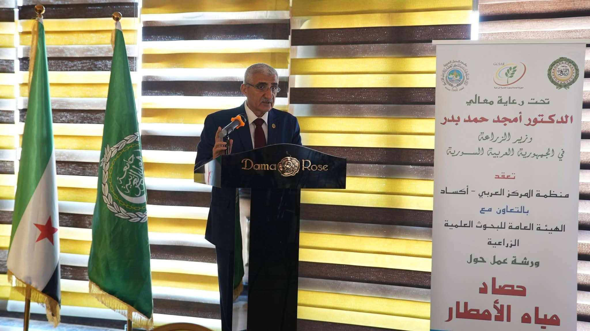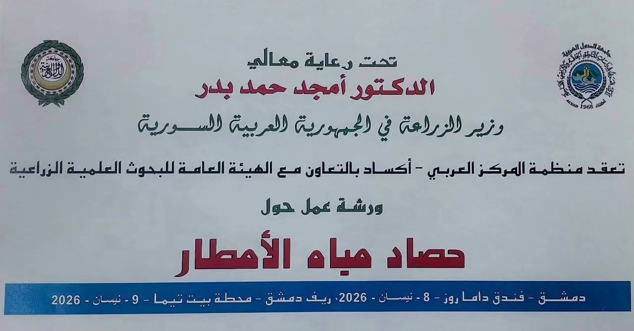 برعاية وزير الزراعة في الجمهورية العربية السورية الدكتور أمجد بدر، وبالتعاون مع الهيئة العامة للبحوث العلمية الزراعية، نظّمت منظمة المركز العربي لدراسات المناطق الجافة والأراضي القاحلة (أكساد)، يوم الأربعاء 8 نيسان 2026، ورشة عمل تخصصية حول حصاد مياه الأمطار، بمشاركة أكثر من 100 مسؤول وخبير وممثل عن جهات حكومية ومنظمات دولية معنية بقطاعي المياه والزراعة.